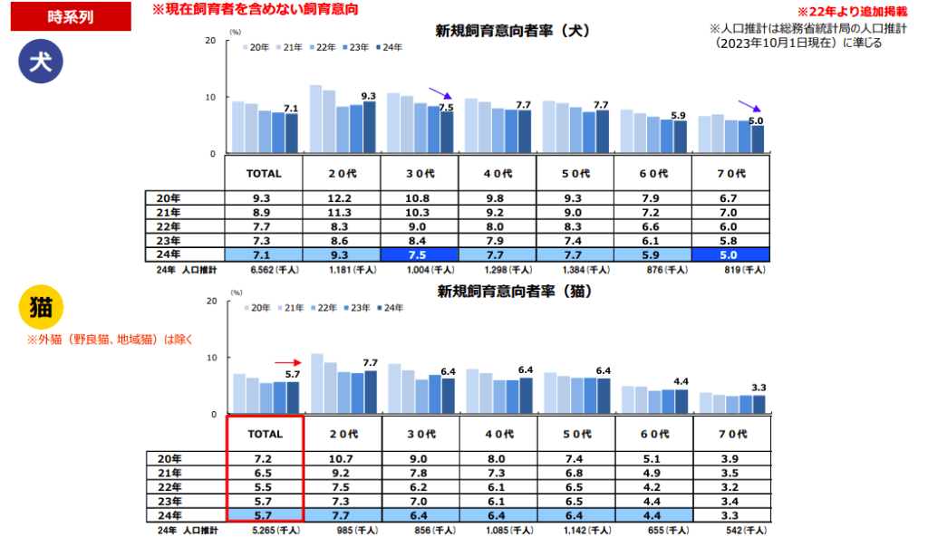 ペット(犬・猫)の今後の飼育意向に関する調査データでは、40代以下の飼育意向の減少が顕著であるなか、それと比較して50代以上のシニア層の減少幅は緩やかです。
