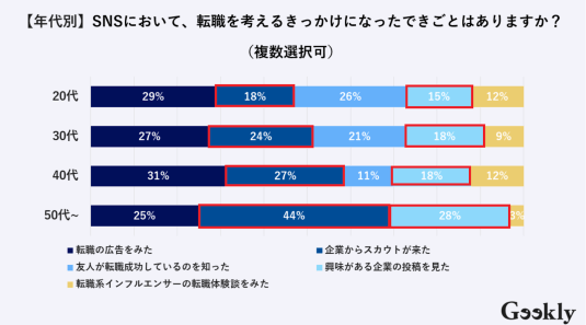 さらに年代別で見ると、50代では「興味がある企業の投稿を見たこと」が転職を考えるきっかけとなった割合が最も高く、シニア層にとっては信頼性のある企業発信がマッチングに直結する重要な要素であることが示されています。