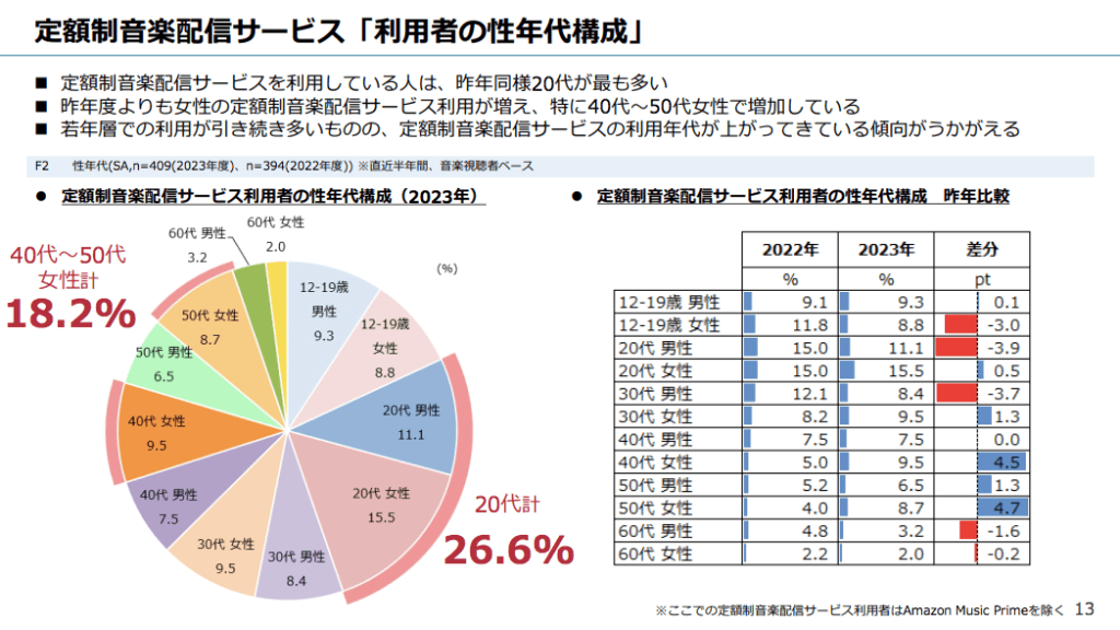 また、2024年3月に行われた日本レコード協会による調査によると、40〜50代女性の音楽配信サービスの利用が増加傾向にあるとわかりました。この結果から、今後音楽配信サービスの利用者の高年齢化、ユーザーの増加が期待できるでしょう。