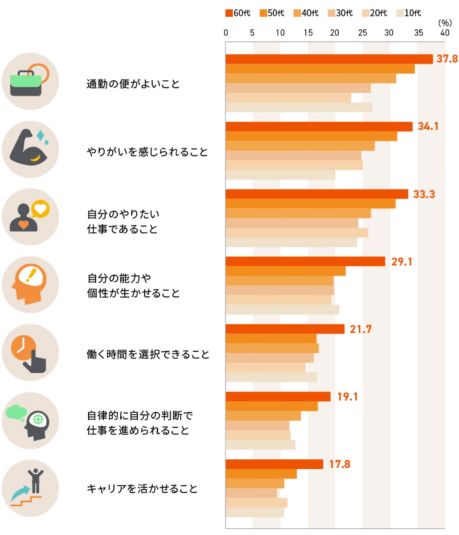 副業が広がる中で、シニア層が仕事に求める価値観にも変化が見られます。同じくパーソル総合研究所の調査では、シニアが仕事選びで重視する点として「通勤の便がよいこと」「やりがいを感じられること」が上位に挙げられました。これは単なる収入確保ではなく、自分らしく働くことや社会との接点を重視している傾向を示しています。