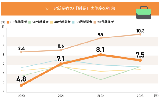 パーソル総合研究所の2023年調査によると、シニアでも特に60代の就業者の7.5%が副業を行っており、20代に次いで高い水準です。勤務時間が短縮される傾向があることから、時間的余裕を活かして副業に取り組むケースが増えていると考えられます。